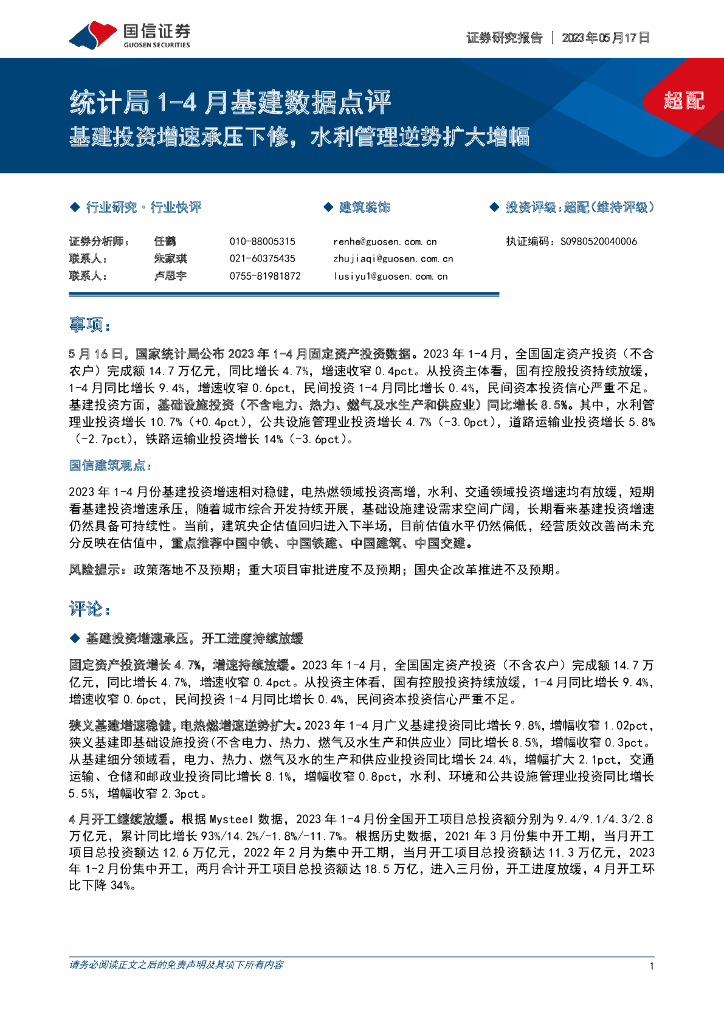 国信证券:建筑装饰:统计局1-4月基建数据点评-基建投资增速承压下修,水利管理逆势扩大增.pdf