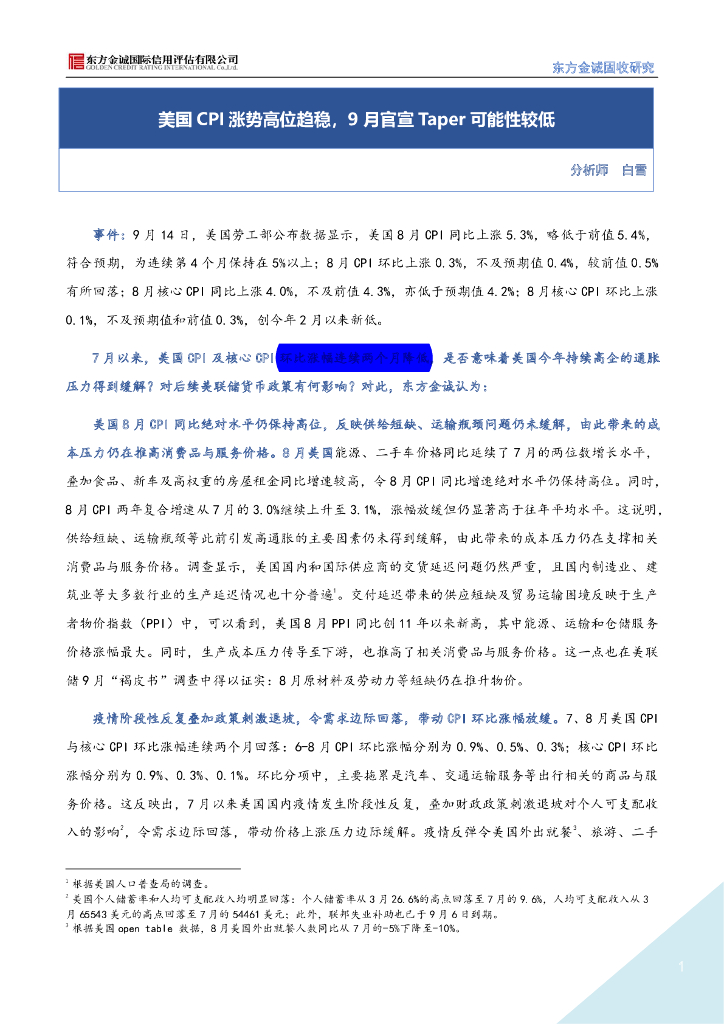 东方金诚:美国CPI涨势高位趋稳,9月官宣Taper可能性较低.pdf