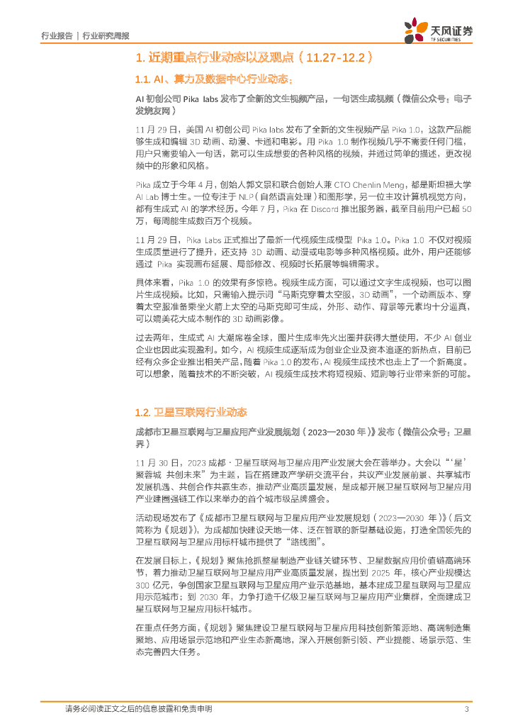 天风证券:通信行业研究周报:Pika labs发布文生视频产品;成都市卫星互联网与卫星应用产业发展规划发布.pdf