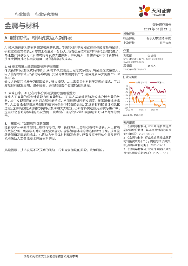 天风证券:金属与材料行业周报:AI赋能时代,材料研发迈入新阶段.pdf