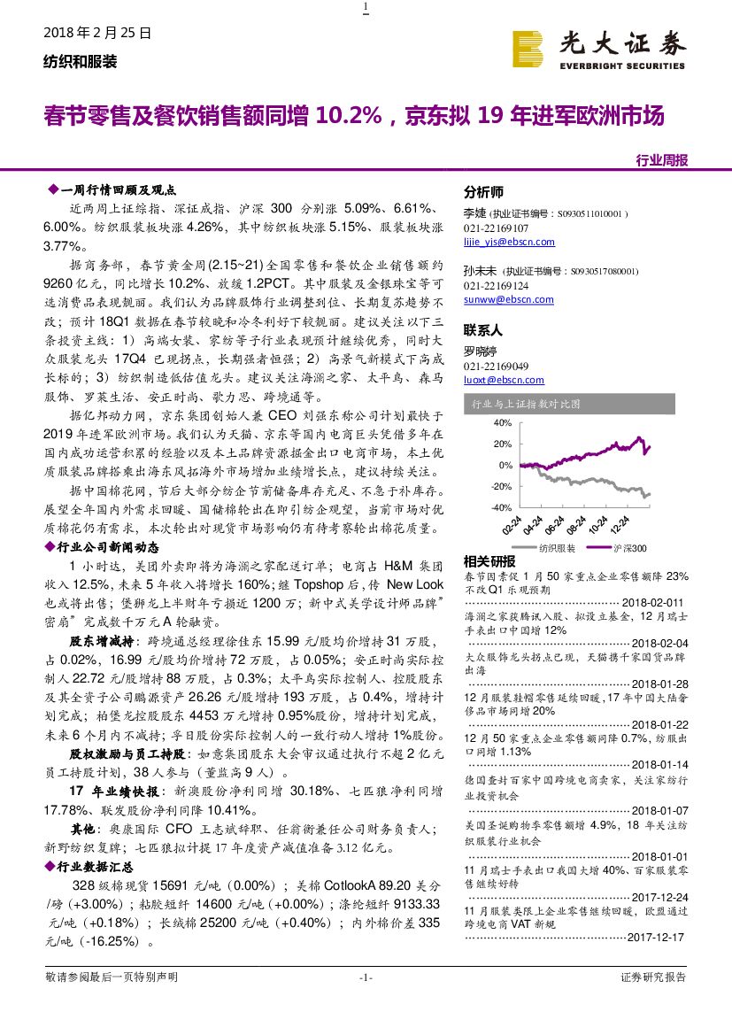 光大证券:纺织和服装行业周报:春节零售及餐饮销售额同增10.2%,京东拟19年进军欧洲市场.pdf