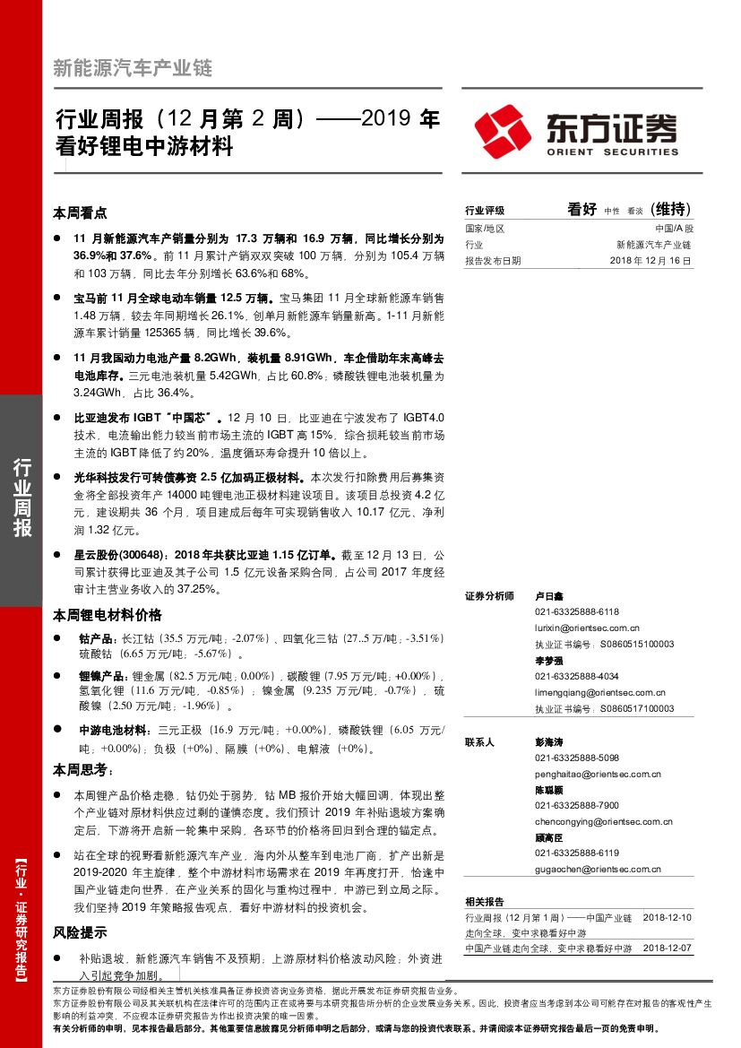 东方证券:新能源汽车产业链行业周报(12月第2周):2019年看好锂电中游材料.pdf