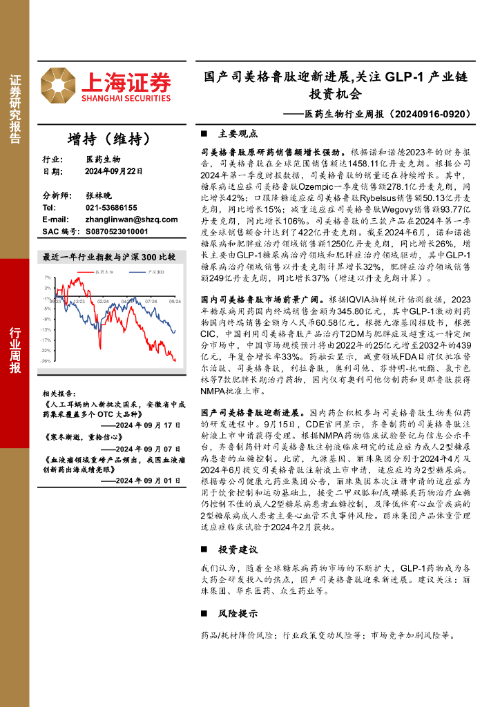 上海证券:医药生物行业周报:国产司美格鲁肽迎新进展,关注GLP-1产业链投资机会.pdf