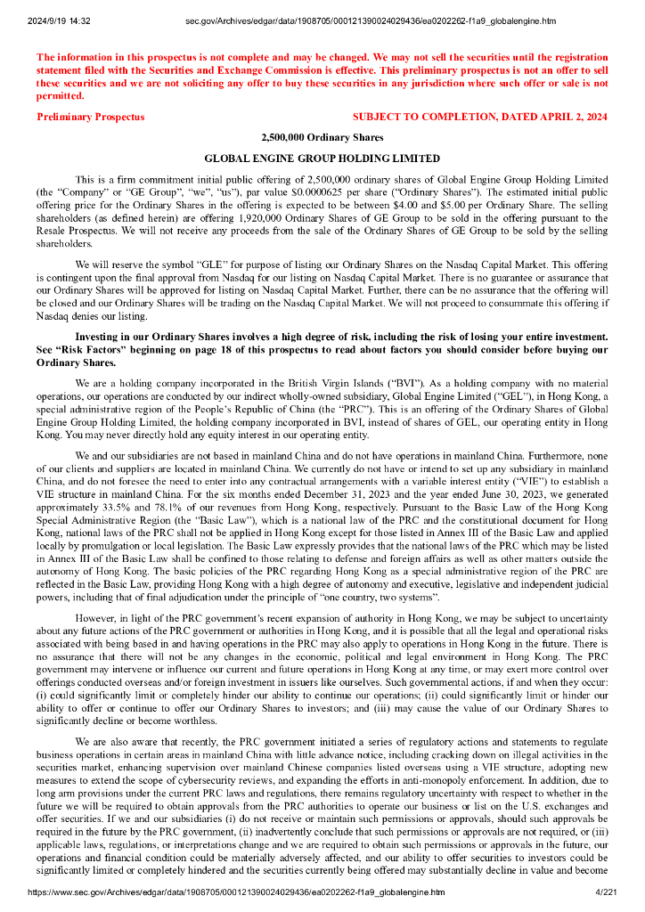 Global Engine Group Holding Limited美股纳斯达克IPO上市招股说明书.pdf