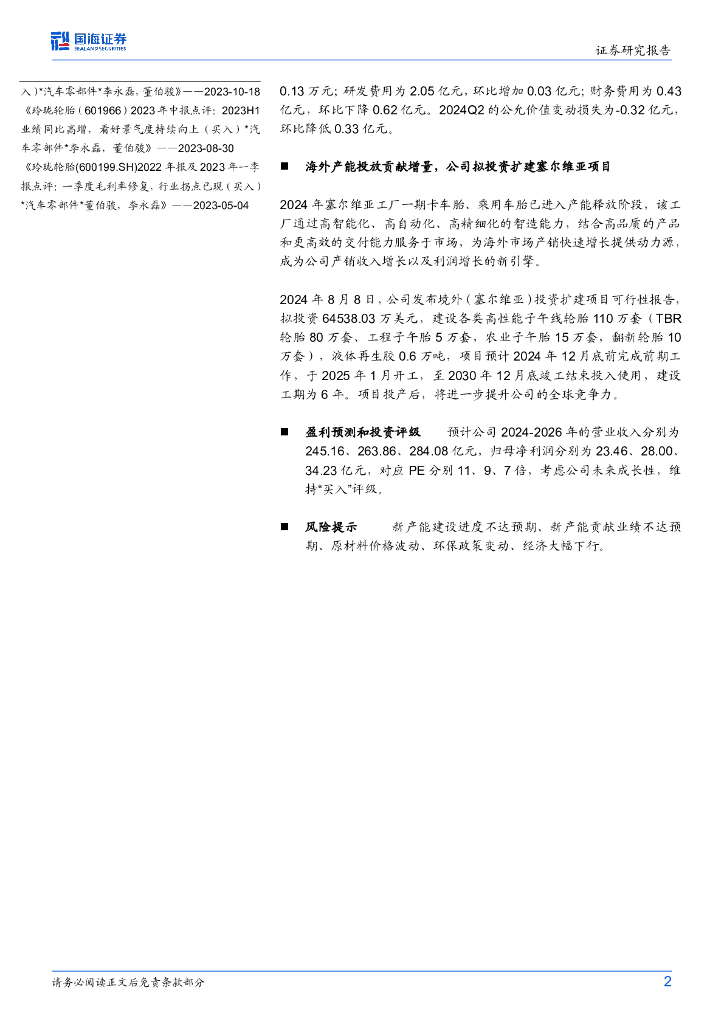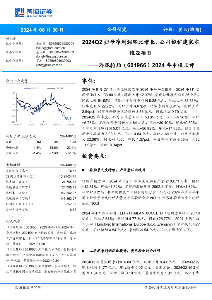 国海证券:玲珑轮胎(601966)-2024年中报点评:2024Q2归母净利润环比增长,公司拟扩建塞尔维亚项目.pdf