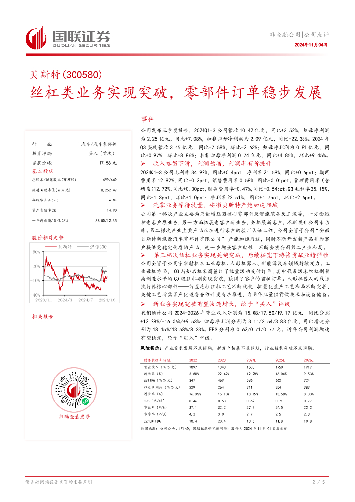国联证券:贝斯特(300580)-丝杠类业务实现突破,零部件订单稳步发展.pdf