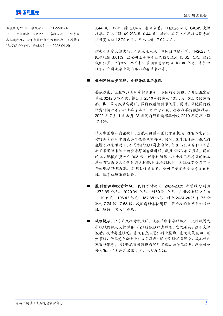 国海证券:中国国航(601111)-2023年中报点评:淡季扣汇业绩环比转正,盈利弹性初步显现.pdf