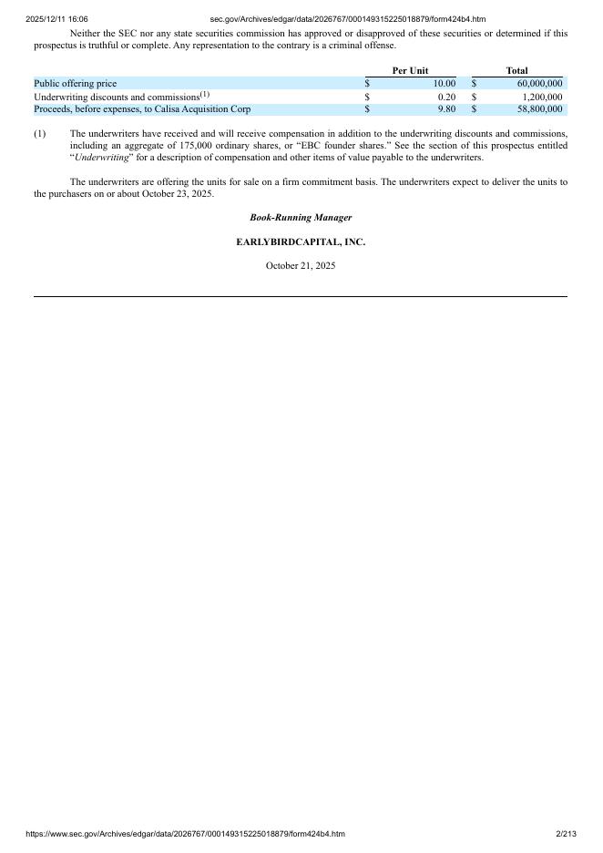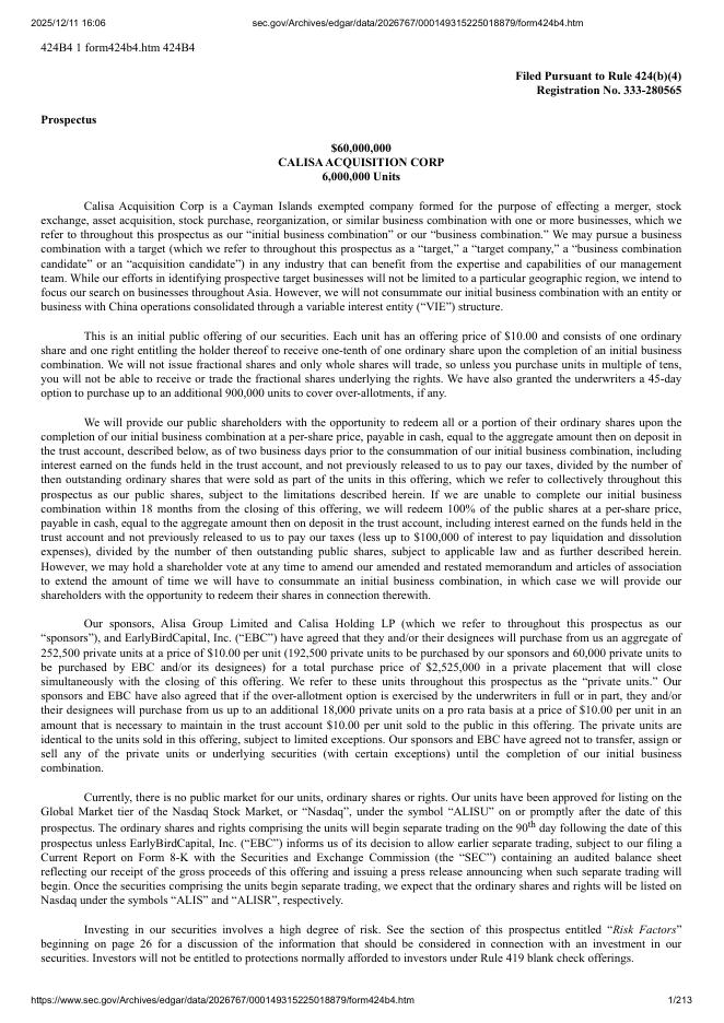 Calisa Acquisition Corp美股纳斯达克IPO上市招股说明书.pdf