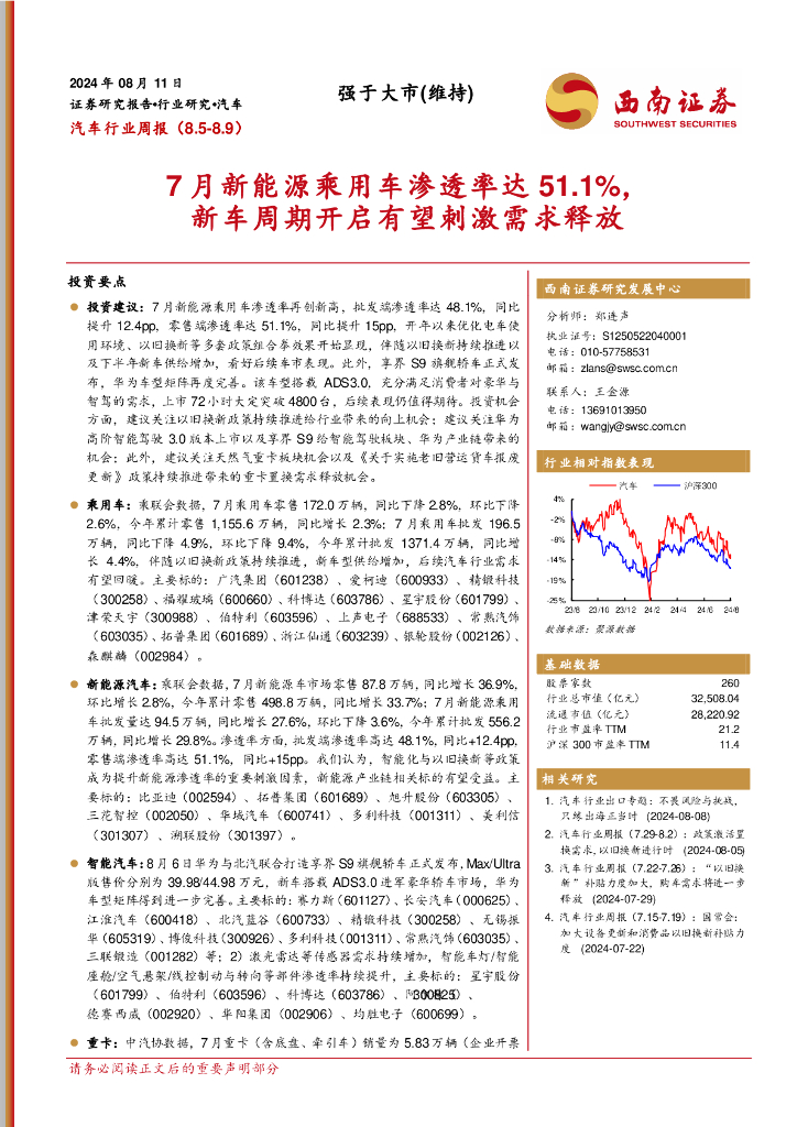 西南证券:汽车行业周报:7月新能源乘用车渗透率达51.1%,新车周期开启有望刺激需求释放.pdf