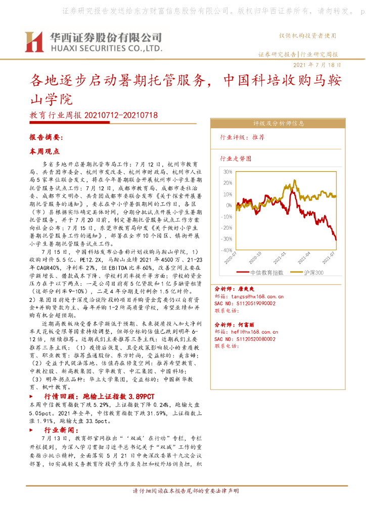 华西证券:教育行业周报:各地逐步启动暑期托管服务,中国科培收购马鞍山学院.pdf