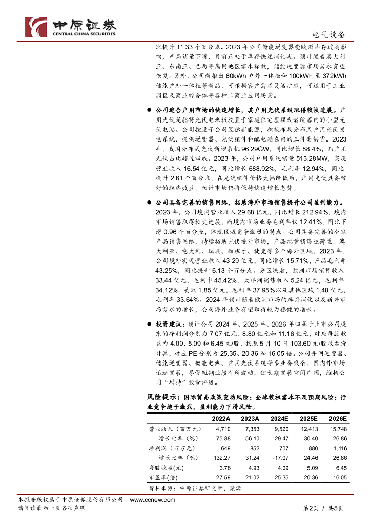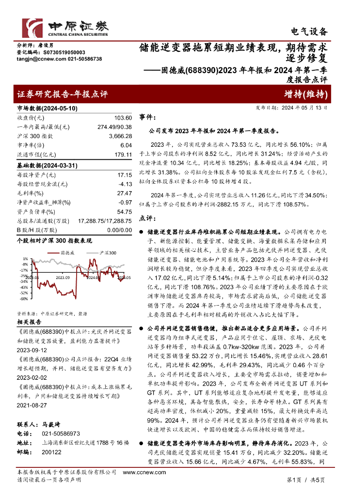 中原证券:固德威(688390)-2023年年报和2024年第一季度报告点评:储能逆变器拖累短期业绩表现,期待需求逐步修复.pdf