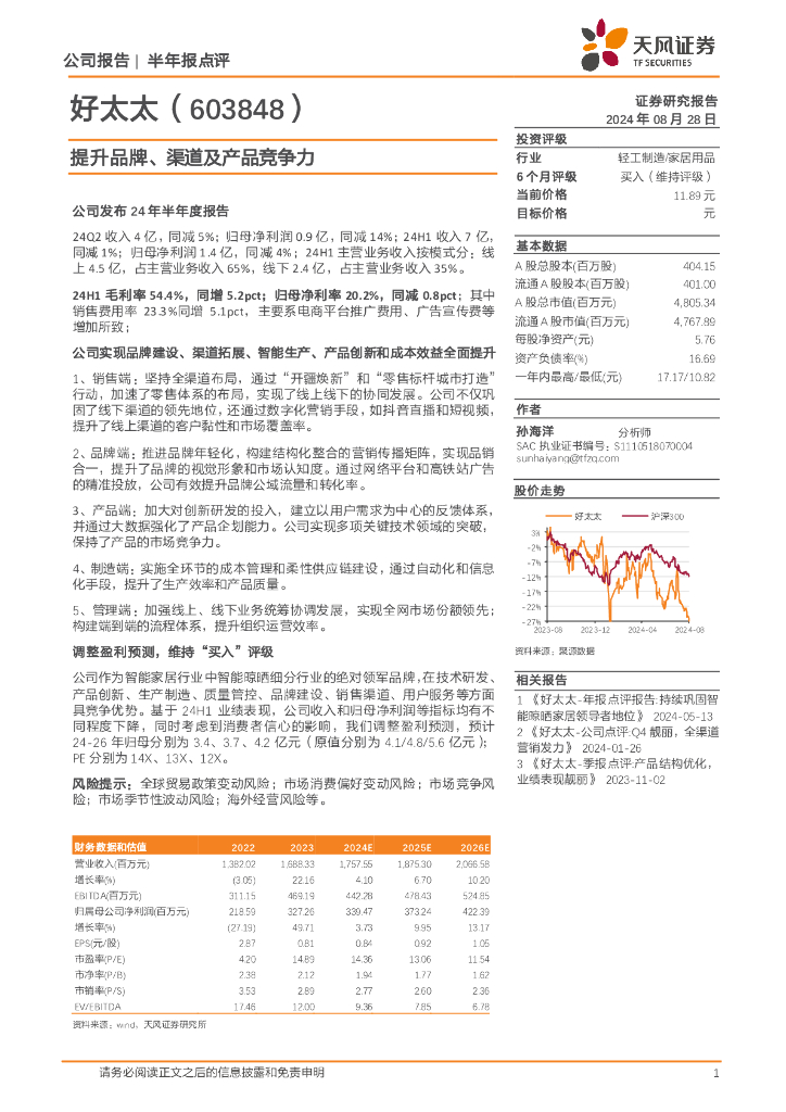 天风证券:好太太(603848)-提升品牌、渠道及产品竞争力.pdf
