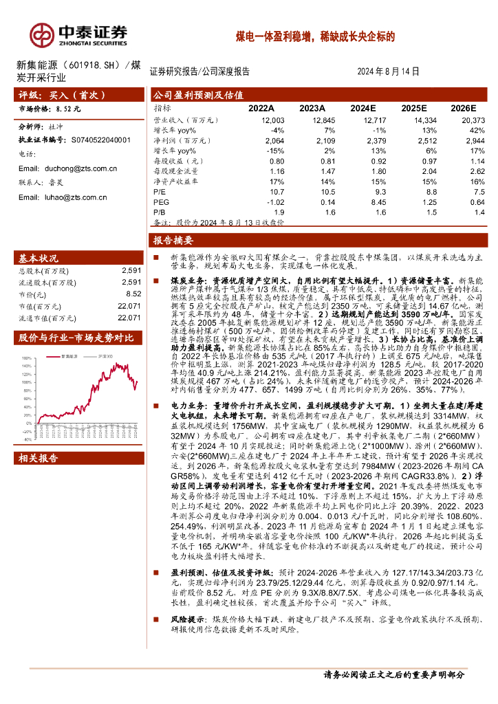 中泰证券:新集能源(601918)-煤电一体盈利稳增,稀缺成长央企标的.pdf
