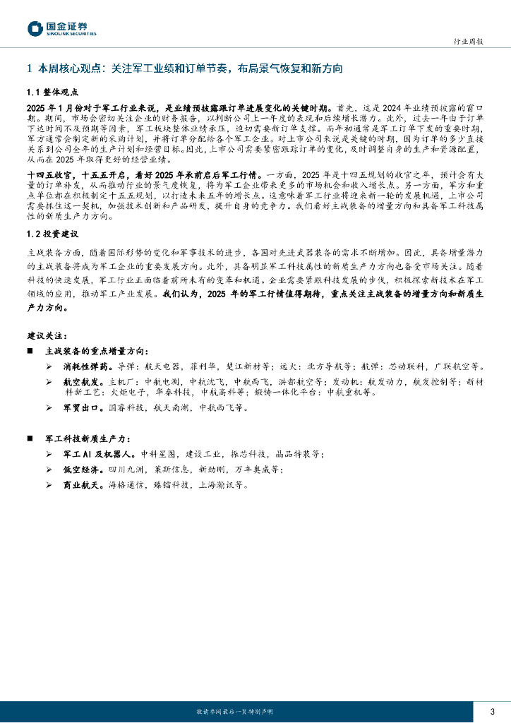 国金证券:军工行业研究:关注军工业绩和订单节奏,布局景气恢复和新方向.pdf