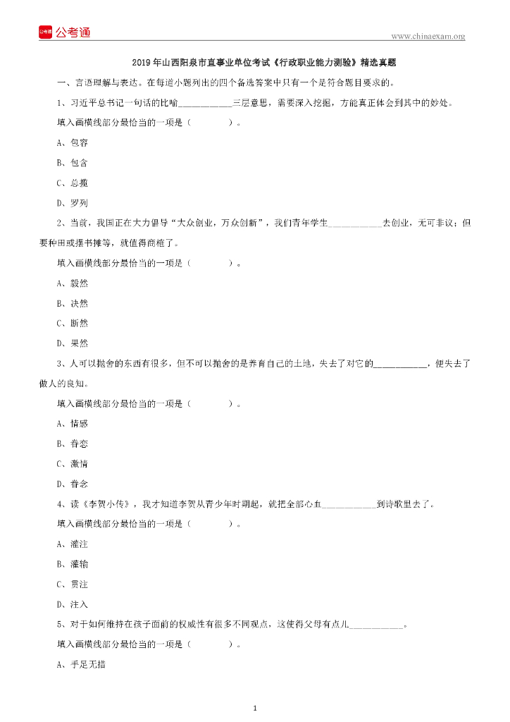 2019年山西阳泉市直事业单位考试《行政职业能力测验》精选真题.pdf