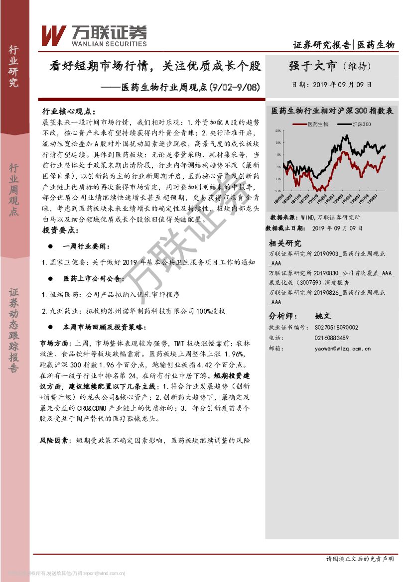 万联证券:医药生物行业周观点:看好短期市场行情,关注优质成长个股.pdf