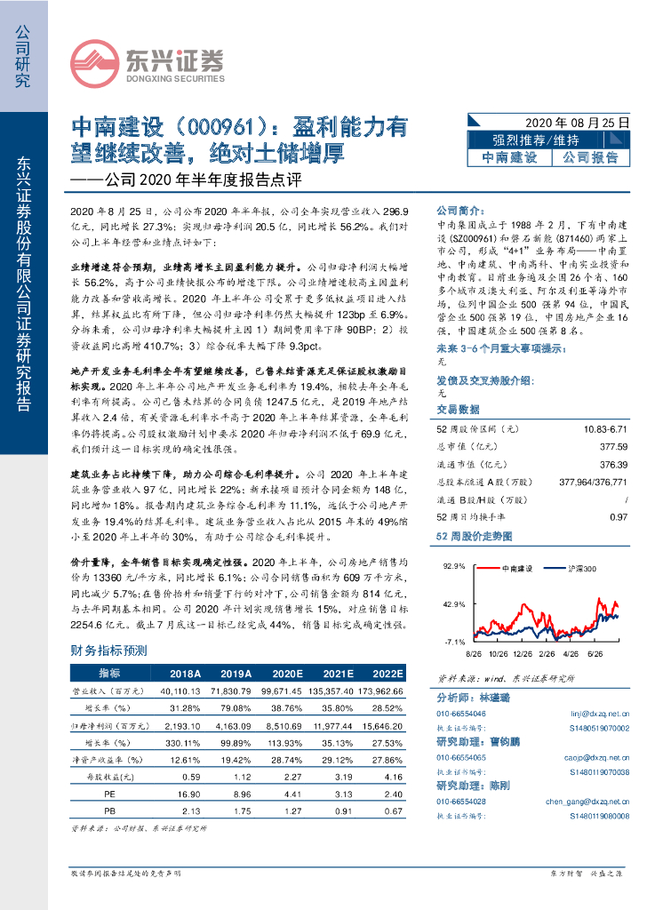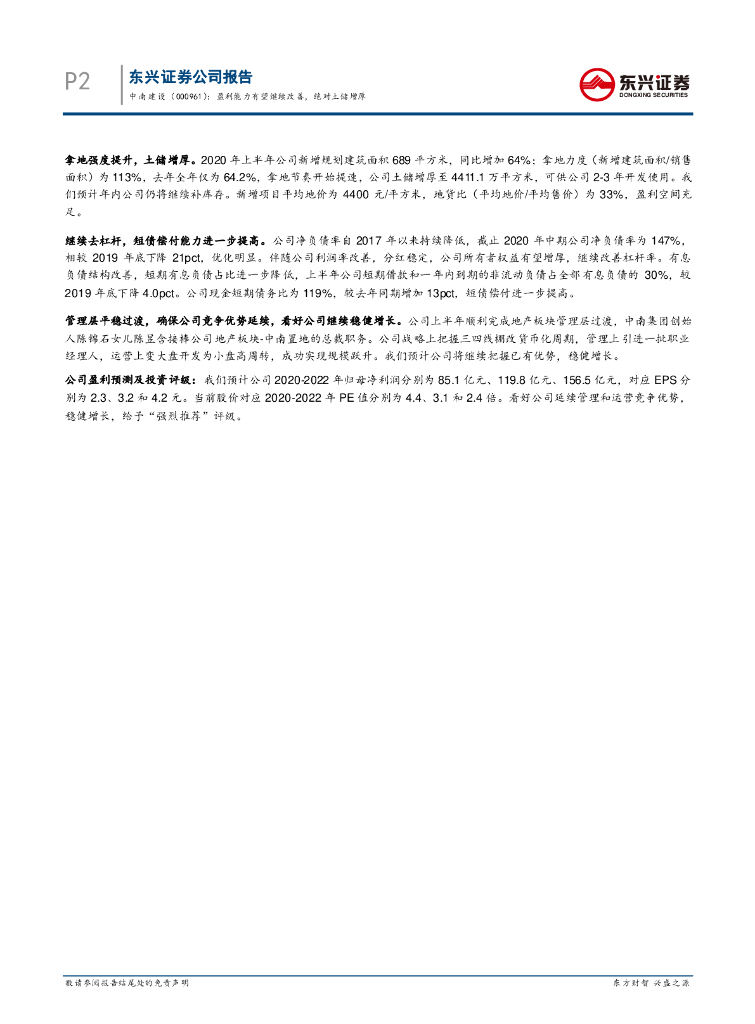 东兴证券:中南建设(000961)-公司2020年半年度报告点评:盈利能力有望继续改善,绝对土储增厚.pdf