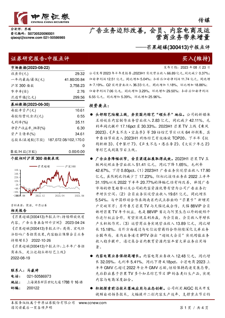中原证券:芒果超媒(300413)-中报点评:广告业务边际改善,会员、内容电商及运营商业务带来增量.pdf