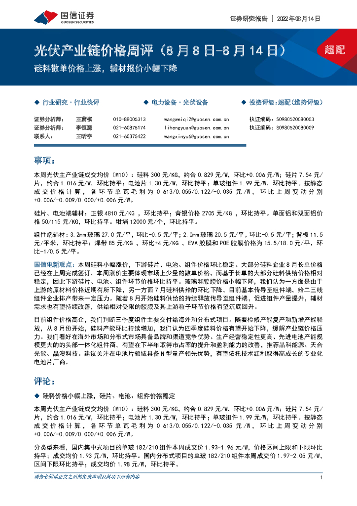 国信证券:光伏产业链价格周评:硅料散单价格上涨,辅材报价小幅下降.pdf