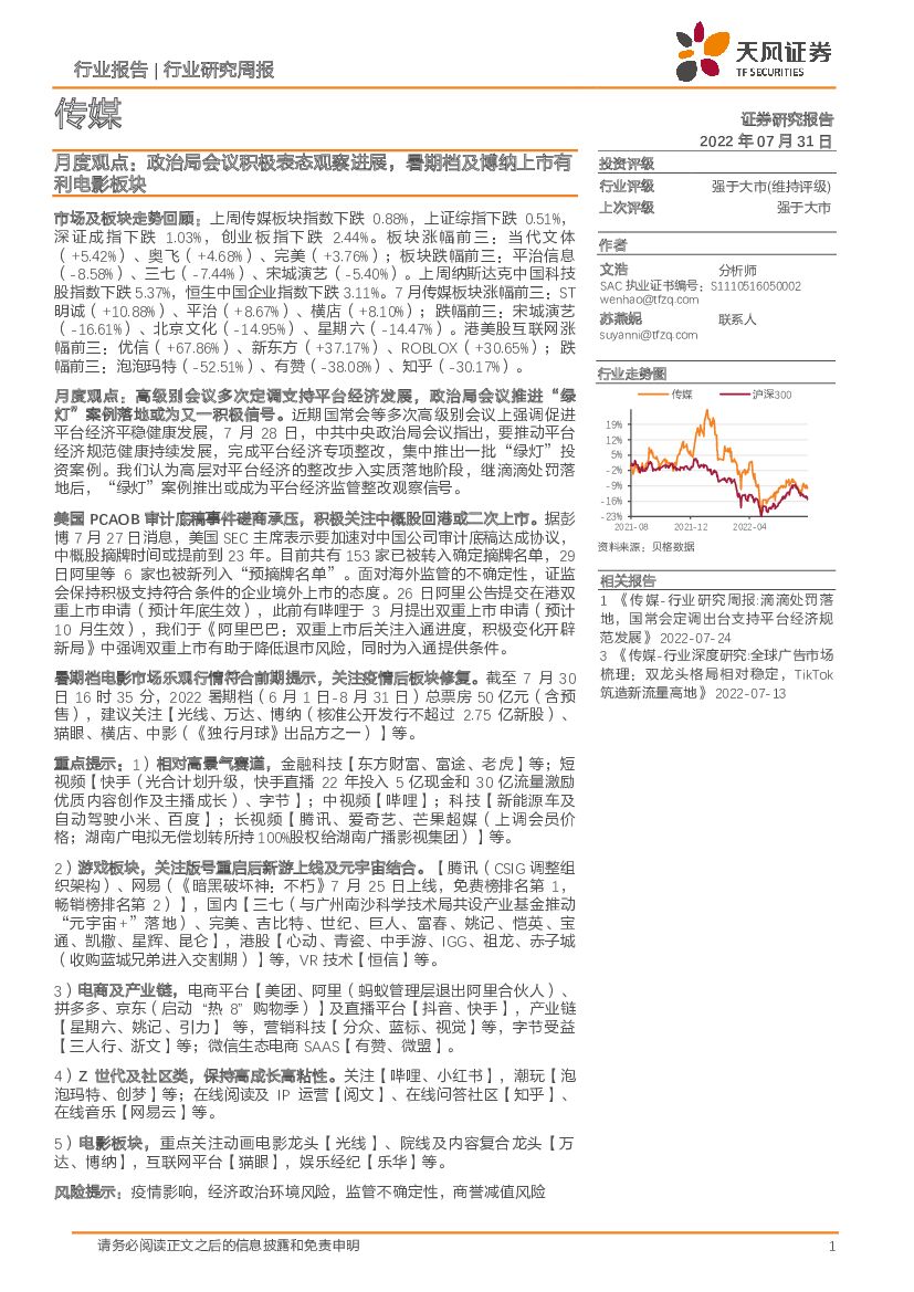 天风证券:传媒行业月度观点:政治局会议积极表态观察进展,暑期档及博纳上市有利电影板块.pdf