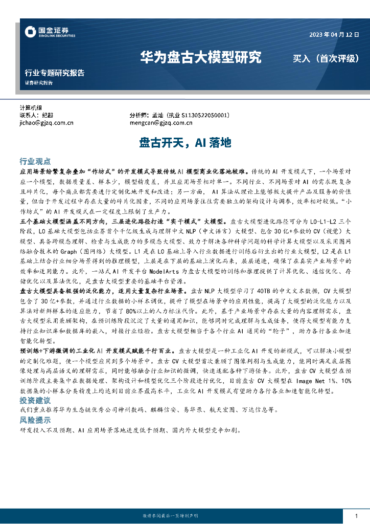 国金证券:计算机行业专题研究报告:华为盘古大模型研究-盘古开天,AI落地.pdf