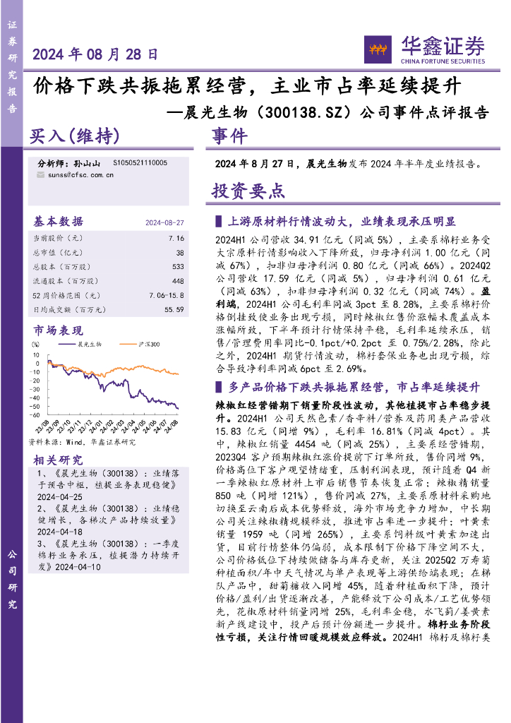 华鑫证券:晨光生物(300138)-公司事件点评报告:价格下跌共振拖累经营,主业市占率延续提升.pdf