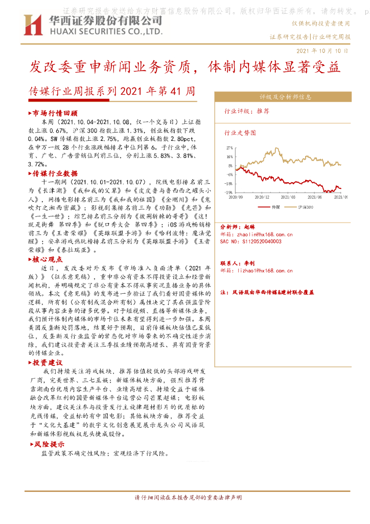 华西证券:传媒行业周报系列2021年第41周:发改委重申新闻业务资质,体制内媒体显著受益.pdf