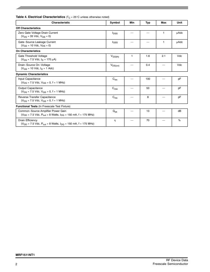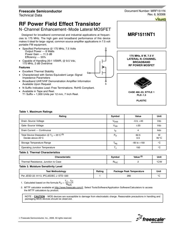 FREESCALE SEMICONDUCTOR - MRF1511NT1 RF Power Field Effect Transistor N- Channel Enhancement- Mode Lateral MOSFET 数据手册.pdf