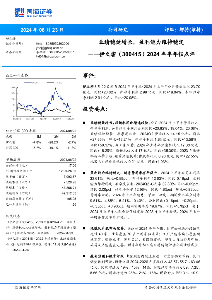 国海证券:伊之密(300415)-2024年半年报点评:业绩稳健增长,盈利能力维持稳定.pdf