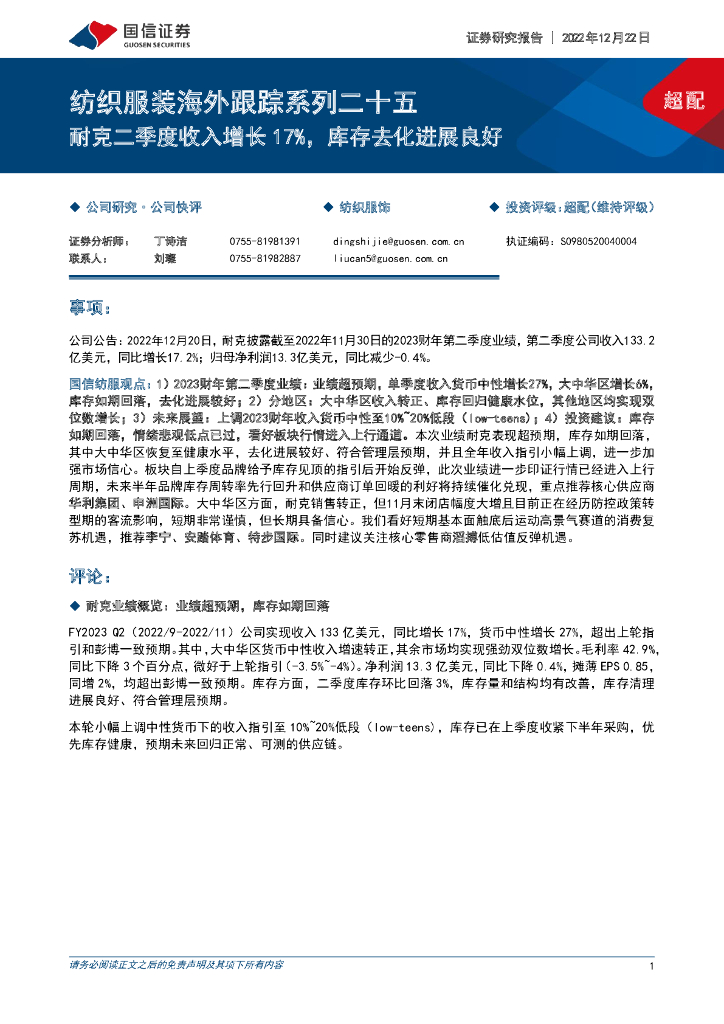 国信证券:纺织服装海外跟踪系列二十五:耐克二季度收入增长17%,库存去化进展良好.pdf