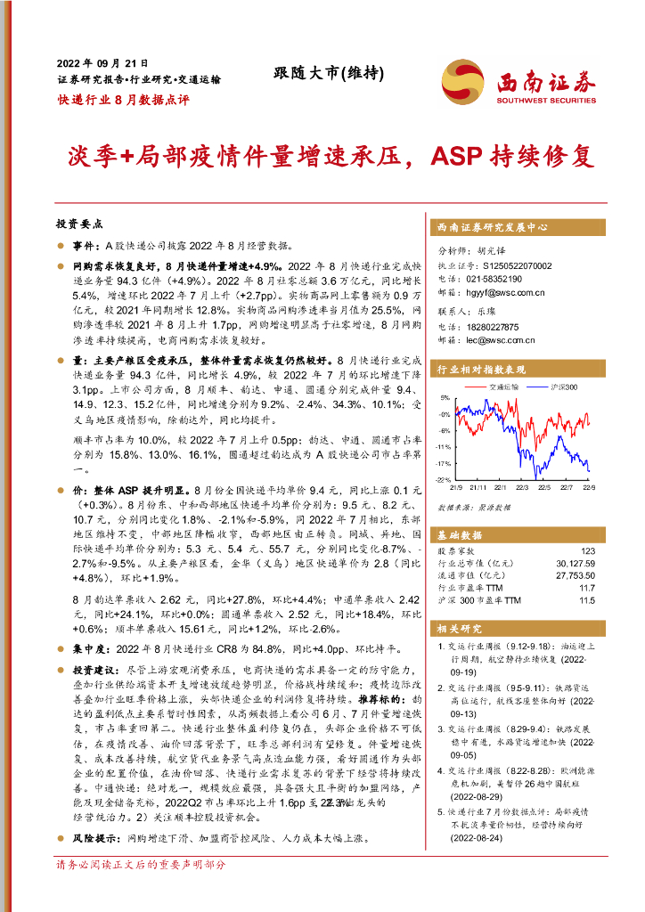 西南证券:快递行业8月数据点评:淡季+局部疫情件量增速承压,ASP持续修复.pdf