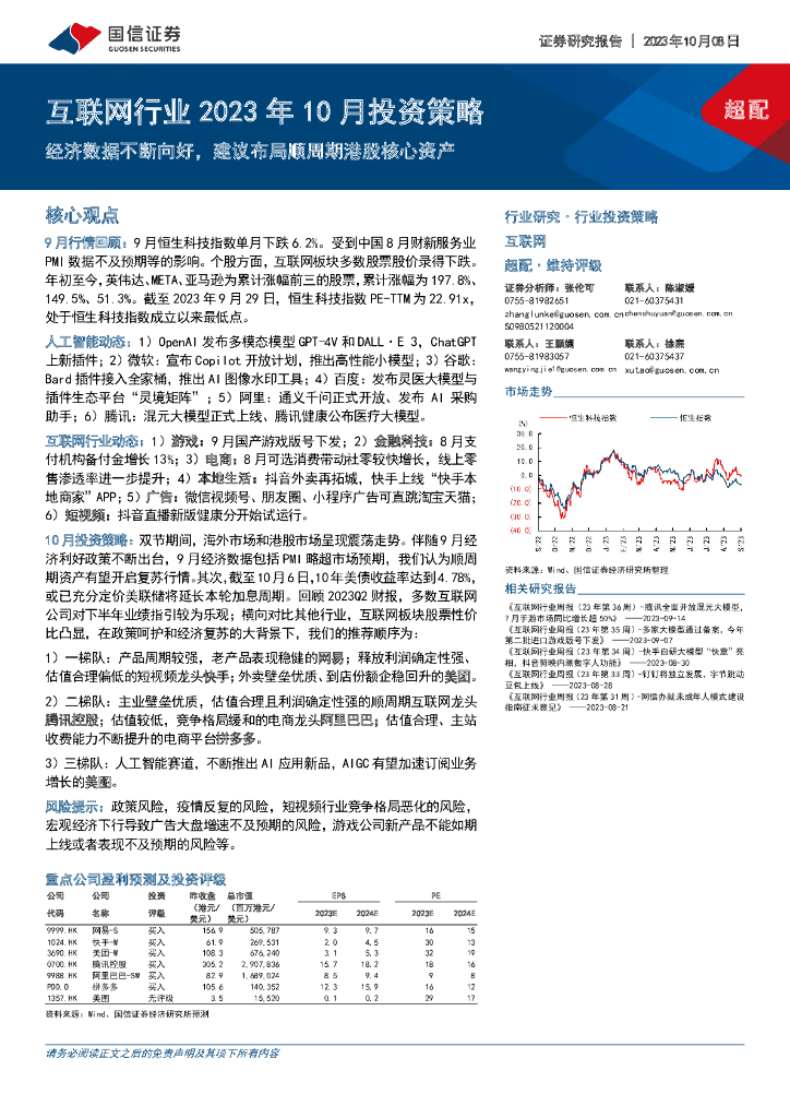 国信证券:互联网行业2023年10月投资策略:经济数据不断向好,建议布局顺周期港股核心资产.pdf