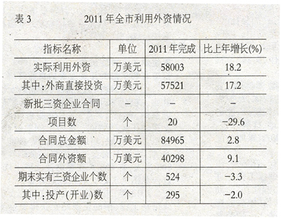 利用外资情况良好。全市实际利用外资58003万美元,增长18.2%,其中,外商直接投资57521万美元,增长17.2%。从批准、注册情况看,年内新批准外资项目20个,合同总金额84965万美元,增长2.8%,合同外资额40298万美元,增长9.1%;年内新注册三资企业19家,注册资本23413万美元,增长16.7%,外方注册资本18497万美元,增长9.6%。年末实有三资企业524家。