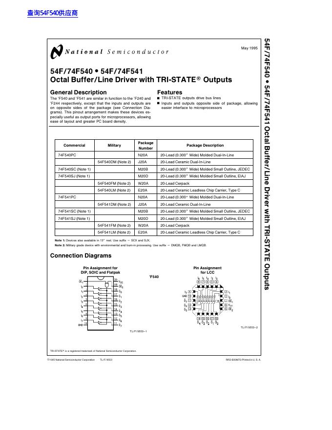 Nationl semiconductor 54F/74F540 # 54F/74F541 Octal Buffer/Line Driver with TRI-STATE Outputs 数据手册.pdf
