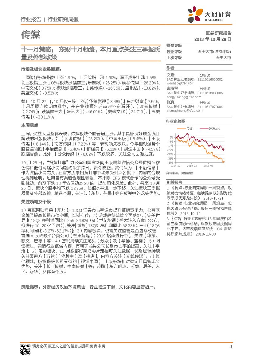天风证券:传媒行业研究周报:十一月策略:东财十月领涨,本月重点关注三季报质量及外部政策.pdf