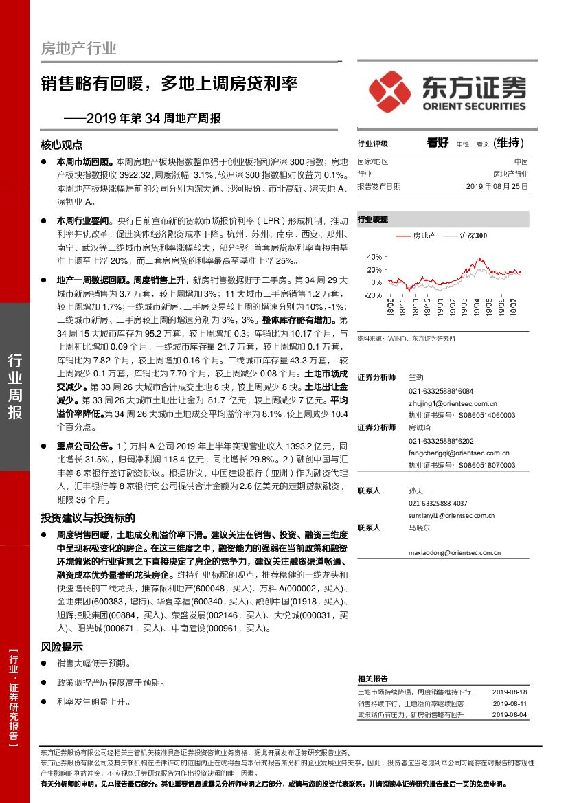 东方证券:房地产行业:2019年第34周地产周报-销售略有回暖,多地上调房贷利率.pdf