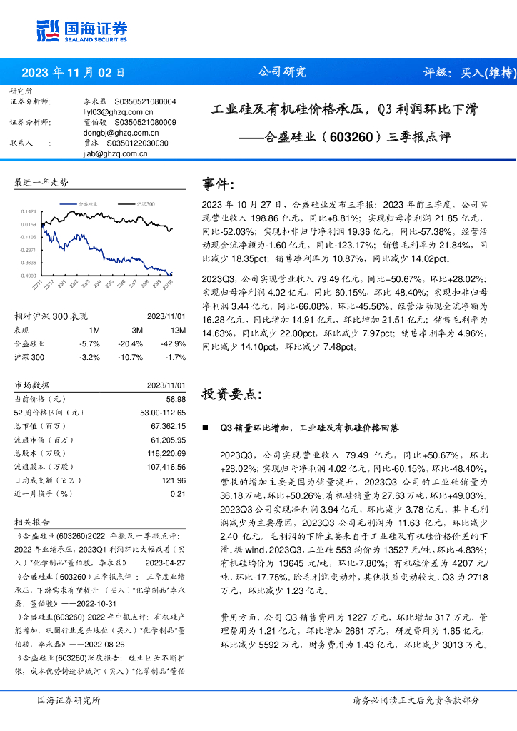 国海证券:合盛硅业(603260)-三季报点评:工业硅及有机硅价格承压,Q3利润环比下滑.pdf