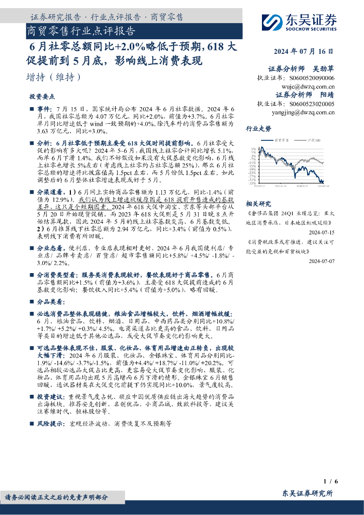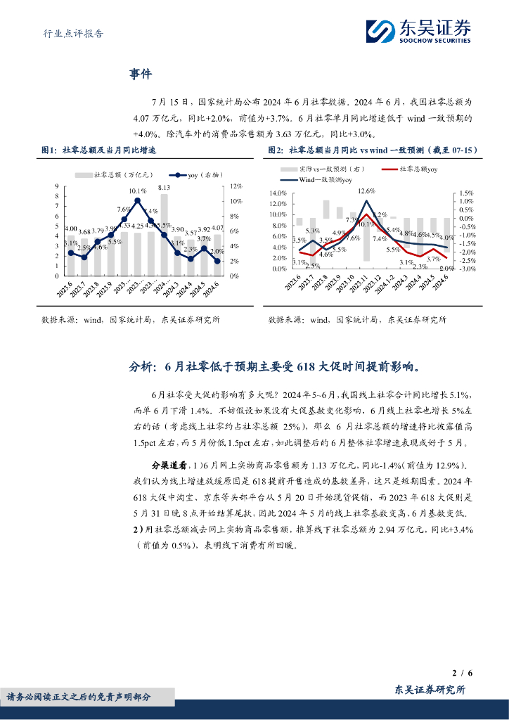 东吴证券:商贸零售行业点评报告:6月社零总额同比+2.0%略低于预期,618大促提前到5月底,影响线上消费表现.pdf