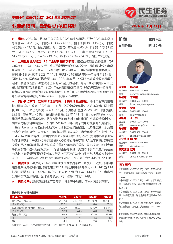 民生证券:宁德时代(300750)-2023年业绩预告点评:业绩超预期,盈利能力依旧强劲.pdf