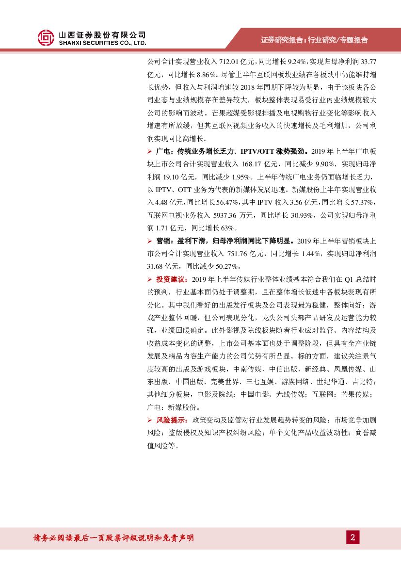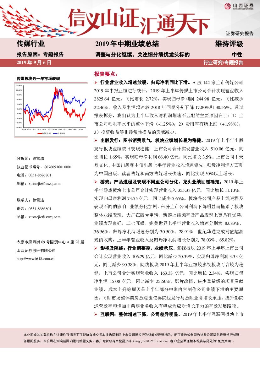 山西证券:传媒行业2019年中期业绩总结:调整与分化继续,关注细分绩优龙头标的.pdf