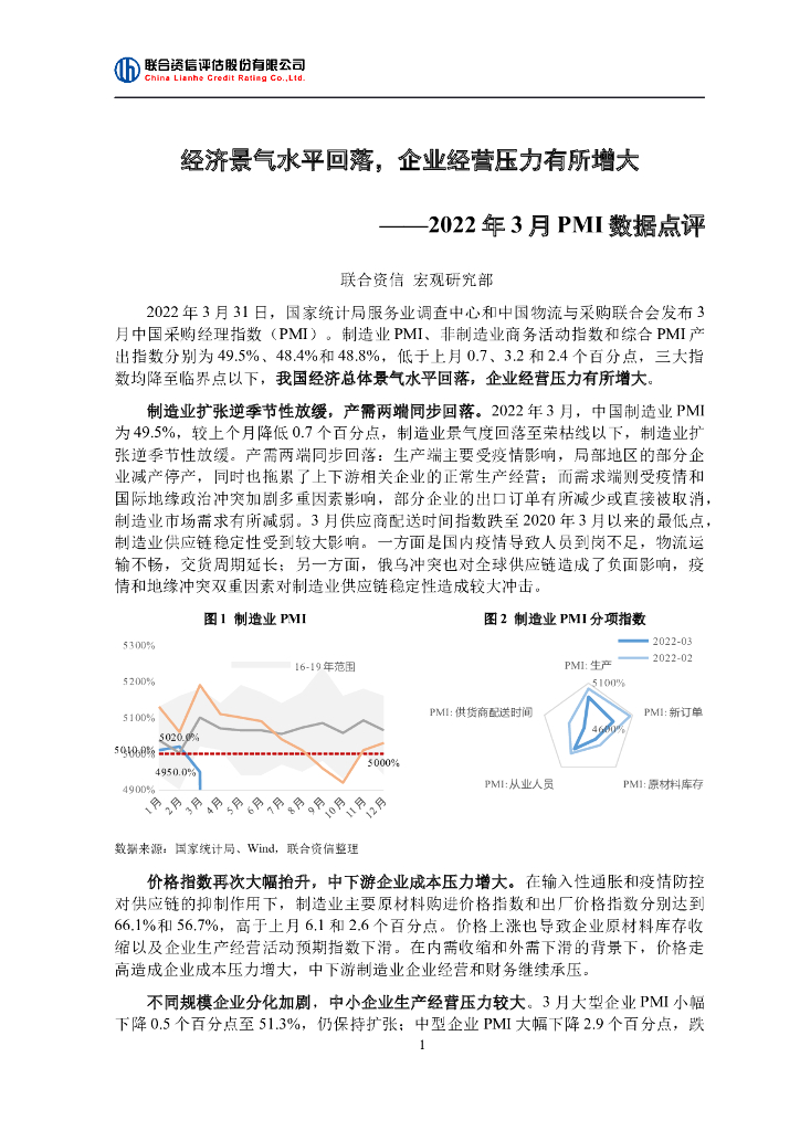 联合资信:经济景气水平回落,企业经营压力有所增大-3月PMI数据点评.doc