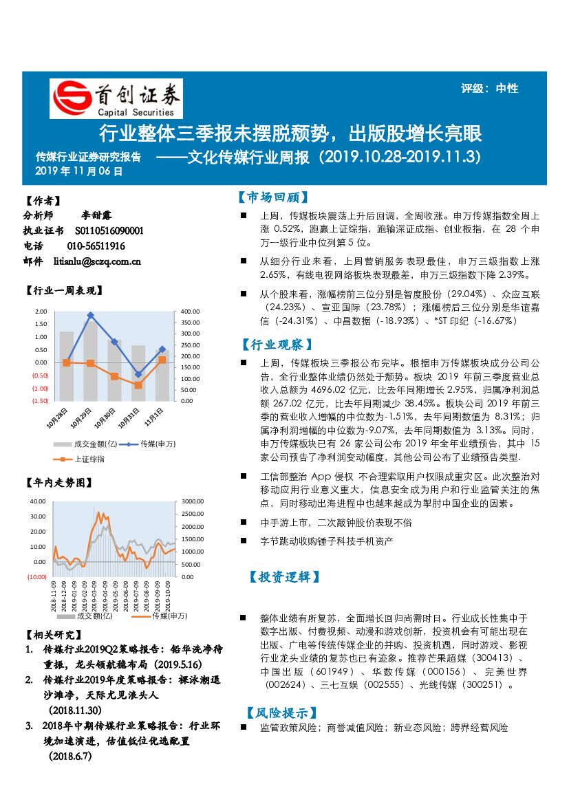 首创证券:文化传媒行业周报:行业整体三季报未摆脱颓势,出版股增长亮眼.pdf