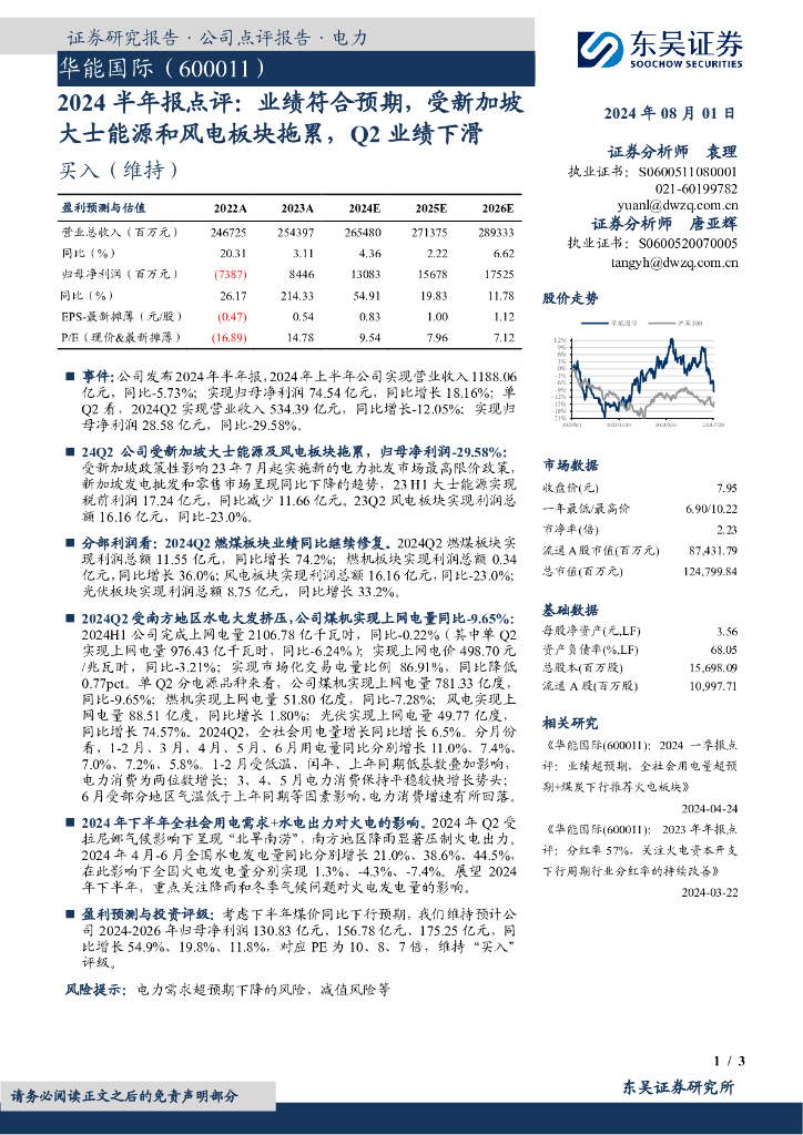 东吴证券:华能国际(600011)-2024半年报点评:业绩符合预期,受新加坡大士能源和风电板块拖累,Q2业绩下滑.pdf