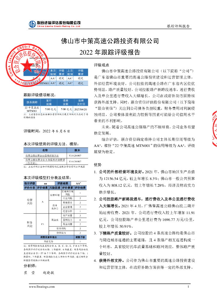 联合资信:佛山市中策高速公路投资有限公司2022年跟踪评级报告.pdf