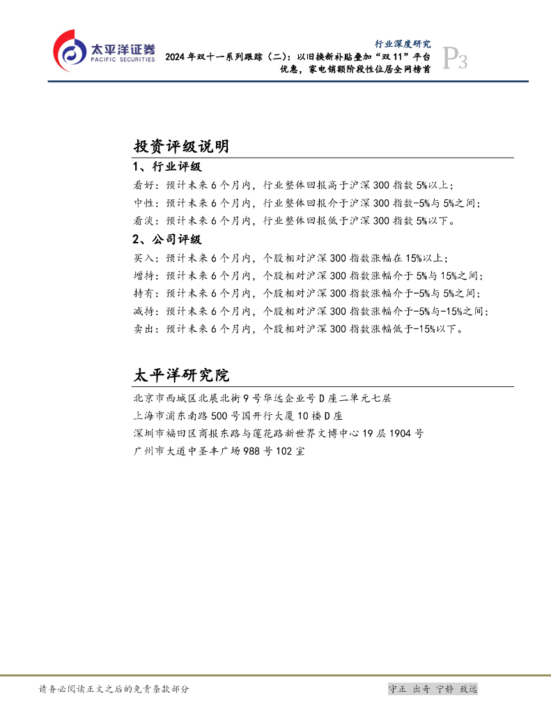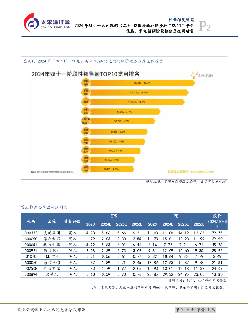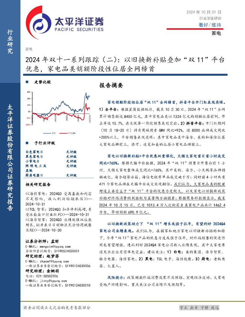 太平洋证券:2024年双十一系列跟踪(二):以旧换新补贴叠加“双11”平台优惠,家电品类销额阶段性位居全网榜首.pdf