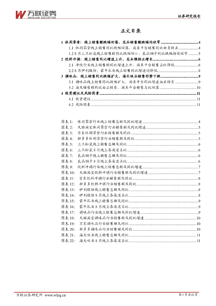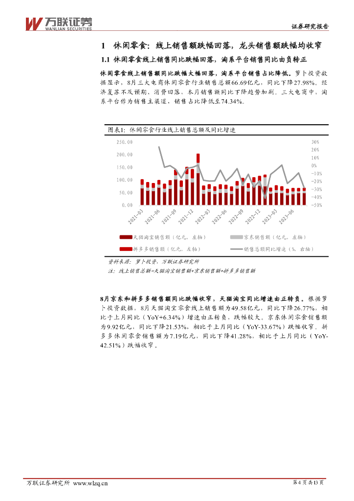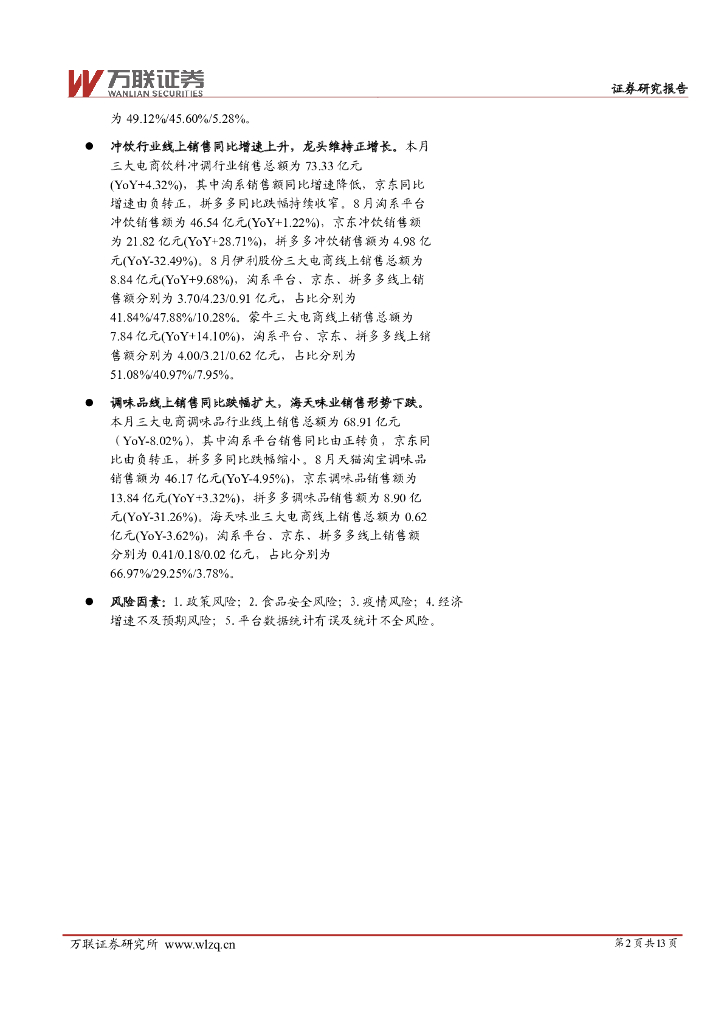 万联证券:大众食品8月电商数据跟踪:8月休闲零食和调味品同比跌幅扩大,冲饮同比增速上升.pdf