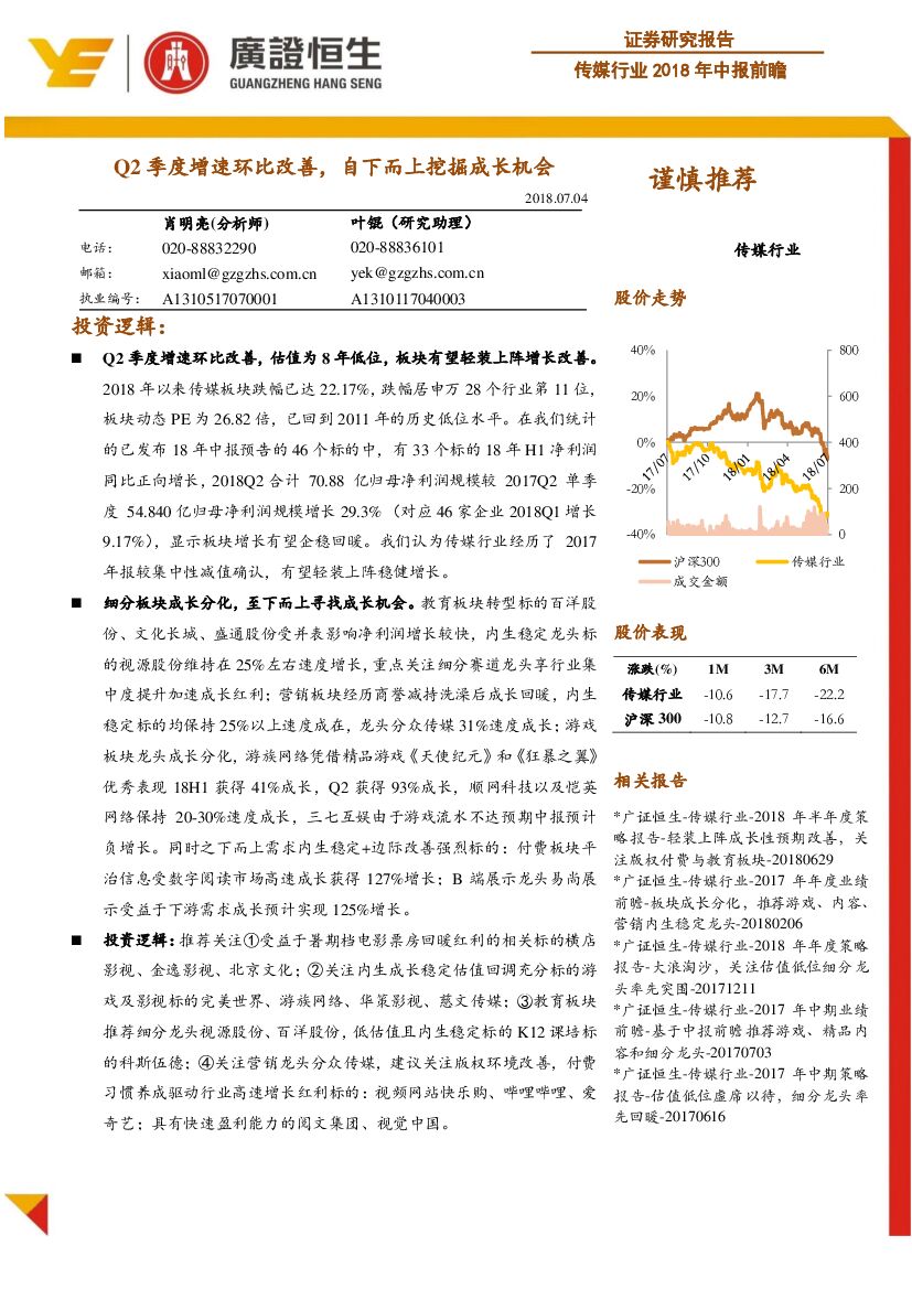 广证恒生证券研究所:传媒行业2018年中报前瞻:Q2季度增速环比改善,自下而上挖掘成长机会.pdf
