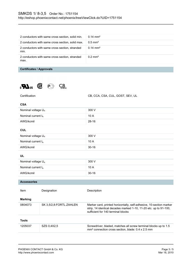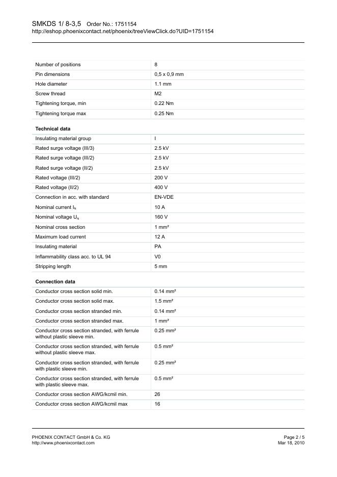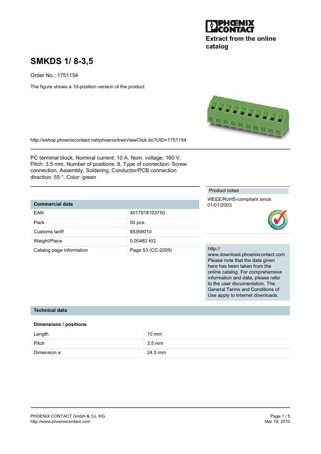 PHOENIX CONTACT SMKDS 1/ 8-3,5 Order No.: 1751154 The figure shows a 10-position version of the product 数据手册.pdf