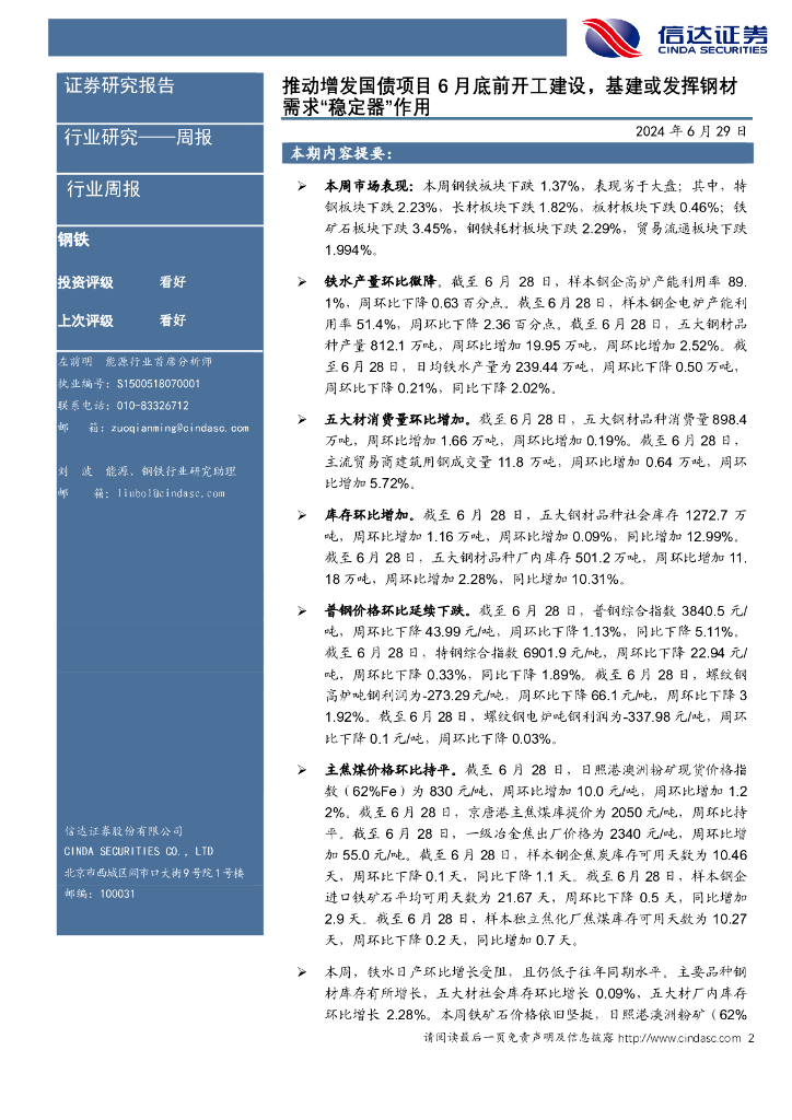 信达证券:推动增发国债项目6月底前开工建设,基建或发挥钢材需求“稳定器”作用钢铁.pdf