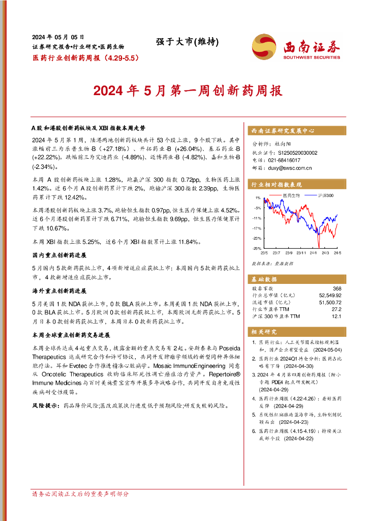 西南证券:医药行业创新药周报:2024年5月第一周创新药周报.pdf